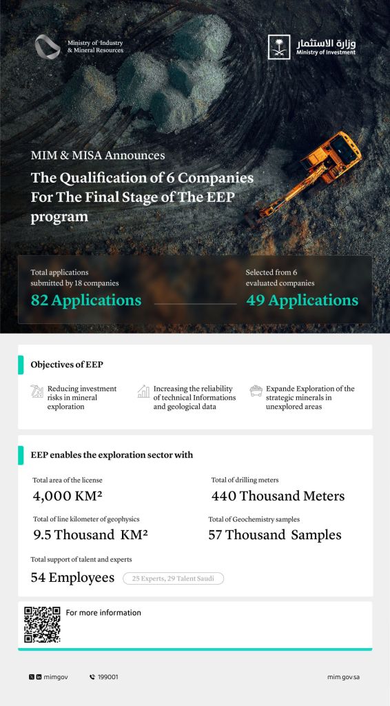 The Ministry of Industry and Mineral Resources (MIM) and the Ministry of Investment (MISA), Saudi Arabia announced the first batch of companies selected for the final stage of the Exploration Enablement Program (EEP).